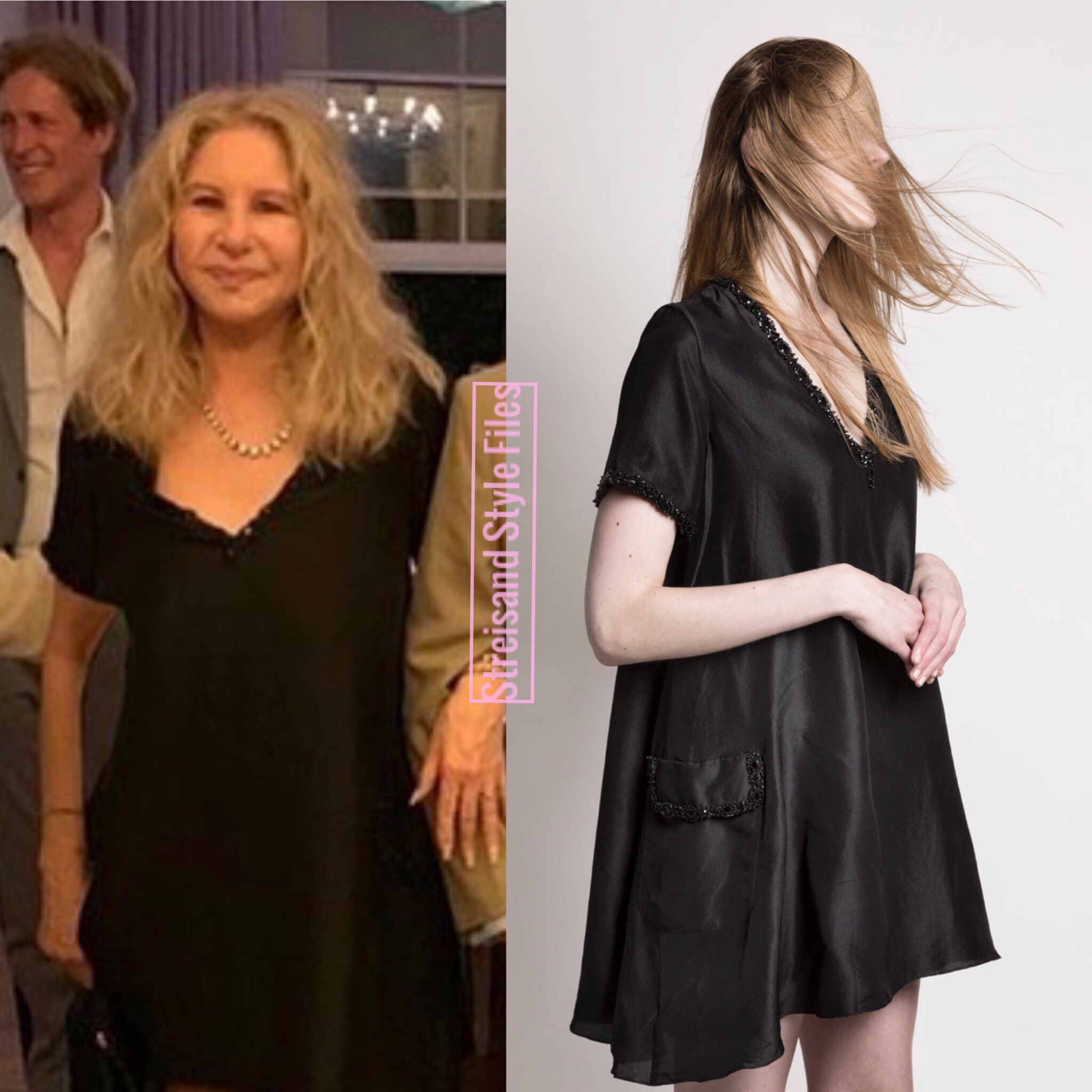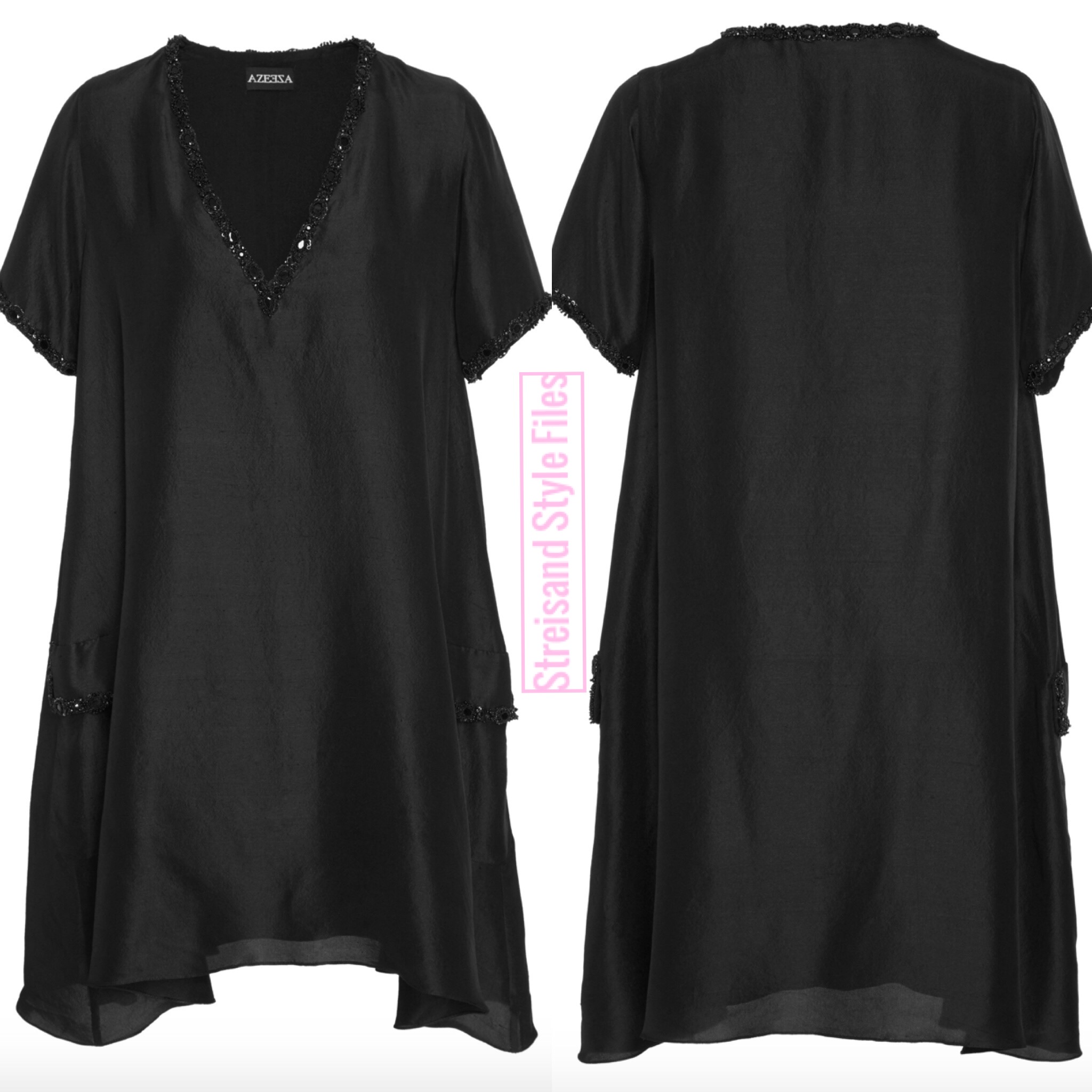 The V-neck dress Barbra chose for her dinner with Valentino, titled “The Erin,” came from Azeeza’s Spring/Summer 2017 collection. The mini-length design was crafted from 100% silk and featured short sleeves, a trapeze silhouette, and two patch pockets. Jet-black, hand-beaded embellishments decorated the neckline, sleeves, and pocket flaps.