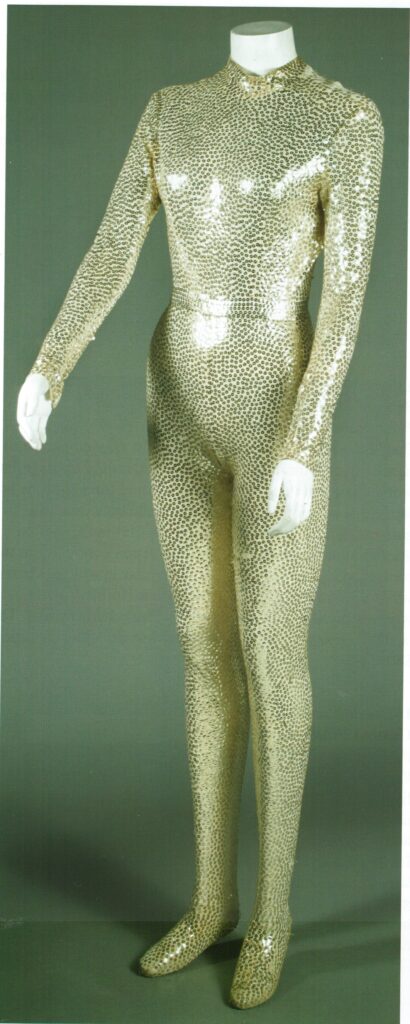 Streisand’s Norell bodysuit has been sold twice at auctions. The first was during Julien’s Her Name is Barbra sale (lot 138), for $5,948. It was resold in 2013 as lot #574 at Nate D. Sanders Auctions. It was described as gold, though the color may have shifted over time due to aging and tarnished sequins. The auction site noted, “Glimmering suit is made of silk chiffon and zips up the back, with zipper closures at both cuffs, built-in footies, and self-belt style detail at the waist. A label within has the phrase ”Yvonne / 546” handwritten upon it. Some tearing to interior lining and loss of sequins to the soles and shoulder areas with scattered minor sequin loss throughout, else near fine.”
