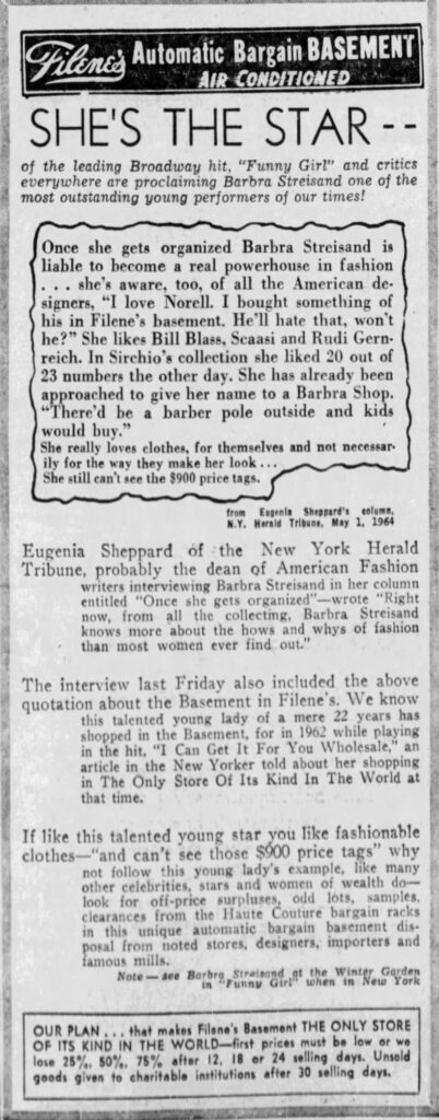 When researching this outfit, I came across a playful ad placed by Filene’s Basement in The Boston Globe in May 1964. The ad quoted a snippet from fashion writer Eugenia Sheppard’s column in the New York Herald Tribune, which mentioned this Norman Norell bodysuit. You can see from it that Streisand was well on her way to building the personal aesthetic that would define her image for decades to come.